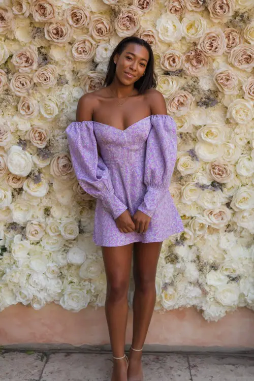 9. A puff sleeve dress in soft lilac is equal parts elegant and fun. The structured fabric and V-neck create a strong silhouette, and the matching lilac heels tie it all together.