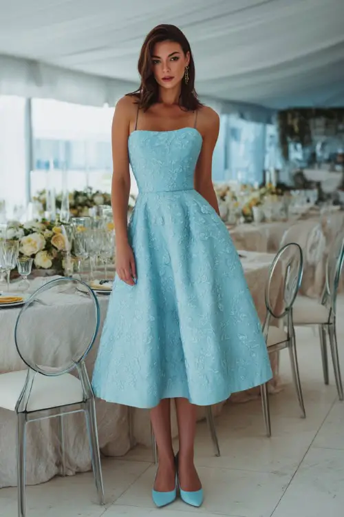 5. A spaghetti strap A-line midi dress in textured sky blue fabric is perfect for an indoor or semi-formal garden wedding.